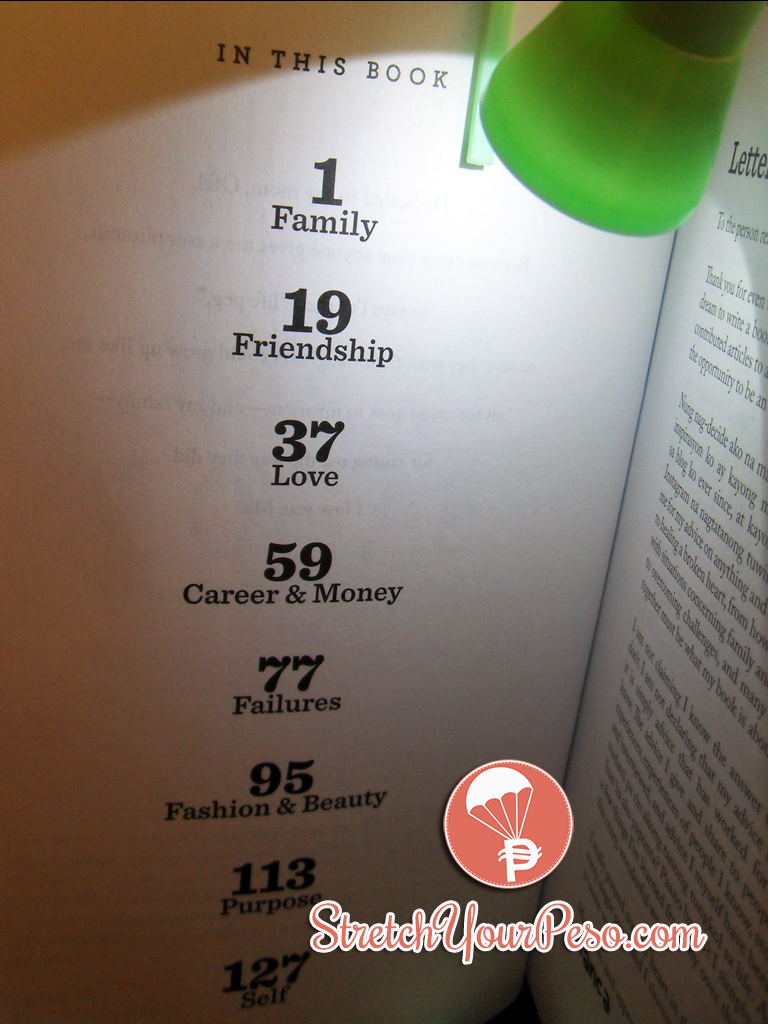 The book is divided into eight chapters: Family, Friendship, Love, Career & Money, Failures, Fashion and Beauty, Purpose and Self. Each chapter tackles the most common issues that the young generation face as they grow up, they also include true stories of not just the author but of other celebrities (like Anne Curtis and Atom Araullo who I'm a fan of), Q&A's, advice from the expert, and more.